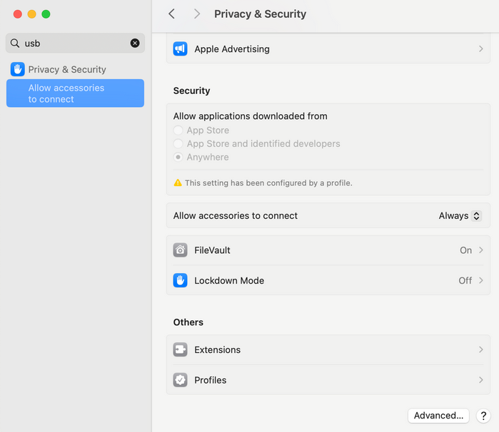 b. Set Allow accessories to connect to Always.